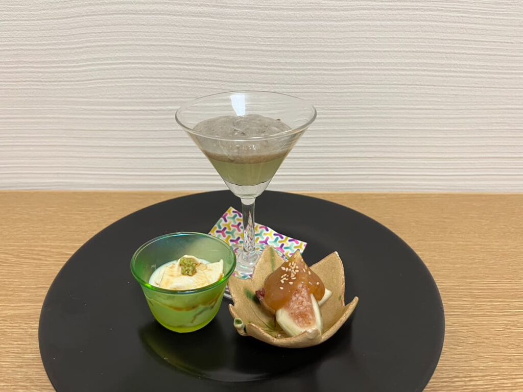 ◆前菜 ピーマン茶碗蒸しとしめじすり流し/冷やし湯葉/無花果